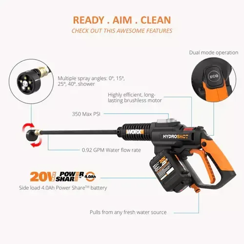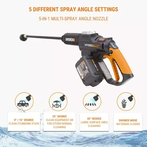 Worx WG630E.5 20V Battery Portable Brushless Pressure Cleaner Hydroshot is the only high-pressure cleaner you can take anywhere. Especially suitable for areas without water and electricity connections. Unlike conventional high-pressure cleaners – bulky devices that do not work without power and water connection via a garden hose – the Hydroshot is powered by a rechargeable battery and draws water from any source.
