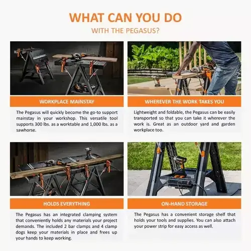 Lightweight yet extremely sturdy! The Worx WX051 Pegasus Work Table is meant for anyone, from first time DIYer to serious professionals looking for portability around the jobsite. Pegasus was designed to be the most versatile work table and sawhorse on the market. It instantly converts from the compact folded mode to clamping work table mode supporting 300 lbs. to the sawhorse mode supporting 1,000 lbs. in seconds, knowing your table is secure with the built-in leg-lock system. The lightweight design makes it easier to bring your Pegasus portable workbench wherever it is needed. The foldable work table’s quick clamps and clamp dogs let you securely hold a variety of materials. Connect multiple Pegasus work tables together to create a unique and versatile work area.