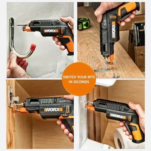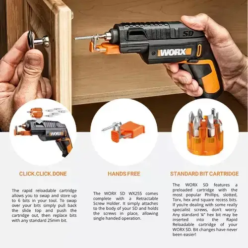 Worx WX255 SD Slide Driver is a screwdriver with a difference, designed to make your job easy! There is always a loose screw somewhere around the house and your screwdriver never seems to fit – until now. This slide driver stores all the 6 popular bits you need directly in the tool screw holder, so the bits never get lost and there is no wasted time fumbling around trying to find the right bit making it the most convenient cordless screwdriver ever. When a project comes up, the slide-action advances to the correct bit instantly by just simply pull back the slide top and push the cartridge out.