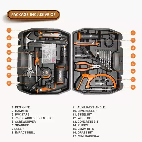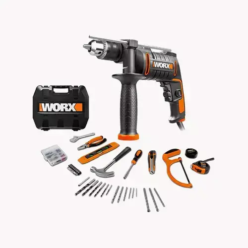 The Worx WX317.3 600W Impact Drill with keyless chuck and metal gear housing is a lightweight, durable and reliable drill. This impact drill with a powerful 600W motor is able to tackle masonry, wood, and metal jobs in and around the home with ease. It has a soft grip rear handle and adjustable side handles with a depth stop for enhanced comfort and accuracy on repetitive tasks for greater control, and a lock-on switch for continuous operation. Featuring a 13mm keyless chuck drill bit changes are quick and easy, while the variable speed control provides greater control and precision when needed.